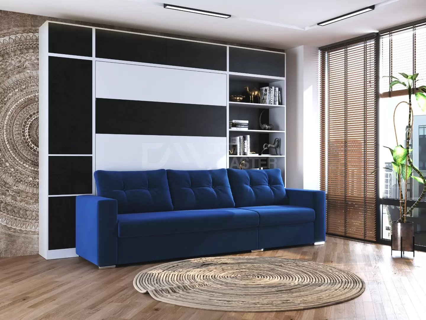 Шкаф-кровать трансформер с диваном "Urban Family Balance" работает на механизме раскладывания собственной разработки "Balance". Кровать раскладывается легким движением руки, превращаясь в полноценное спальное место. Просто потяните за ножку-маятник, которая самостоятельно фиксируется в нужное положение при опускании.